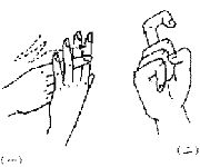 (一)左手五指张开,手背向外;右手伸食指,指尖对着左手来回移动,然后从左手任意一指缝钻出,表示找到了钻营的机会。(二)手指字母“J”的指式。